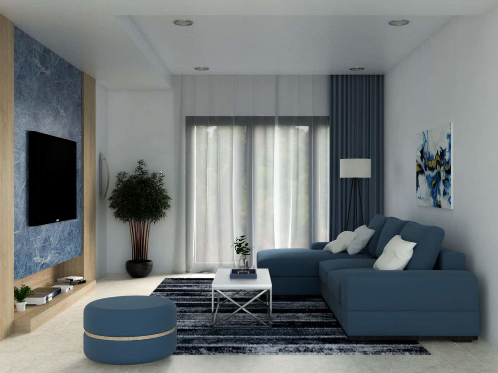 دیوارهای سفید با مبلمان یا پرده آبی: روشنایی و حس پاکیزگی را به فضا می آورد.