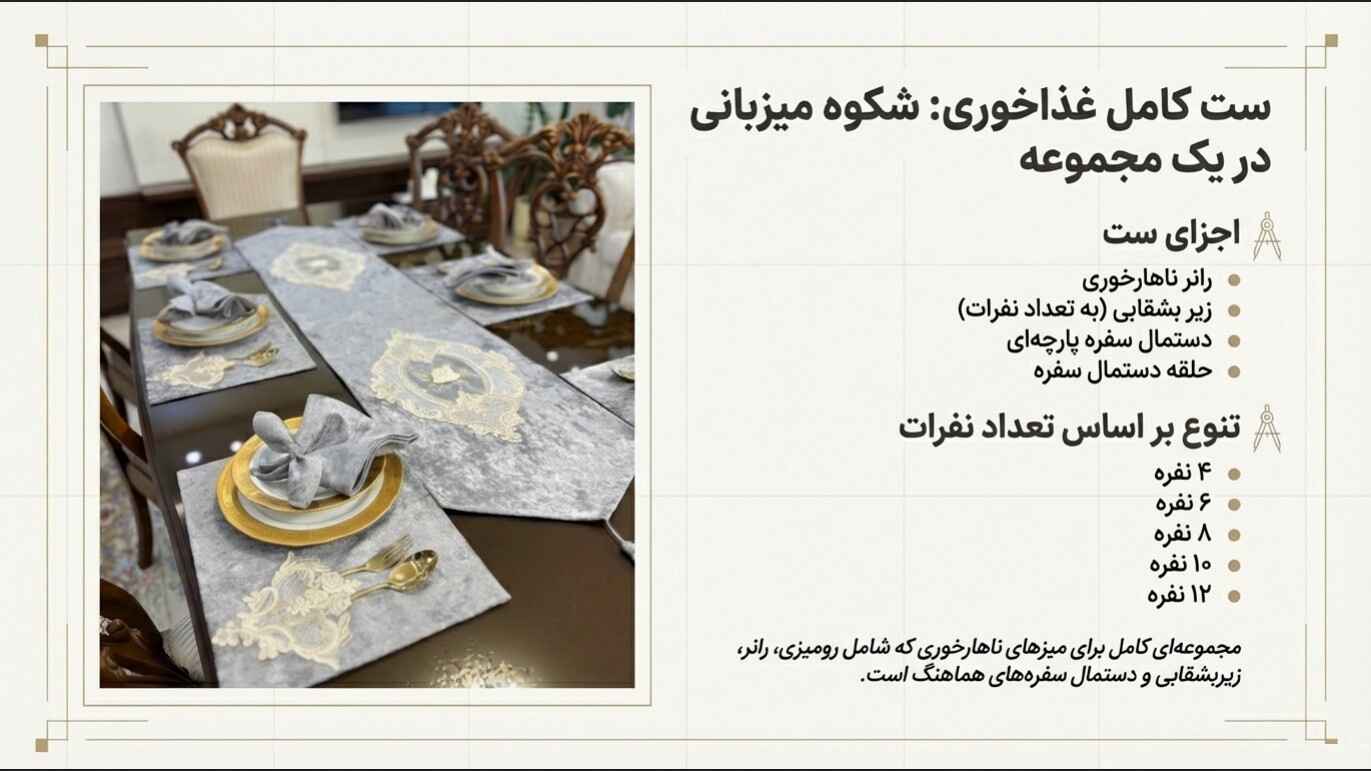 این ستها بهعنوان راهحلهای هوشمندانه و از پیش طراحیشده برای چیدمان میزهای پذیرایی ارائه میشوند و هماهنگی بینقصی را در کوتاهترین زمان ممکن برای شما به ارمغان میآورند.