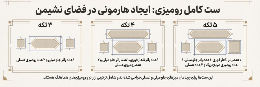 برای دوستداران سبک کلاسیک مدرن (The Modern Classicist): در یک فضای پذیرایی مدرن که به دنبال لمسی از ظرافت کلاسیک است، یک ست ۳ تکه رومیزی (شامل رانر جلومبلی و دو عسلی) فضایی متعادل، هماهنگ و به دور از شلوغی ایجاد میکند.