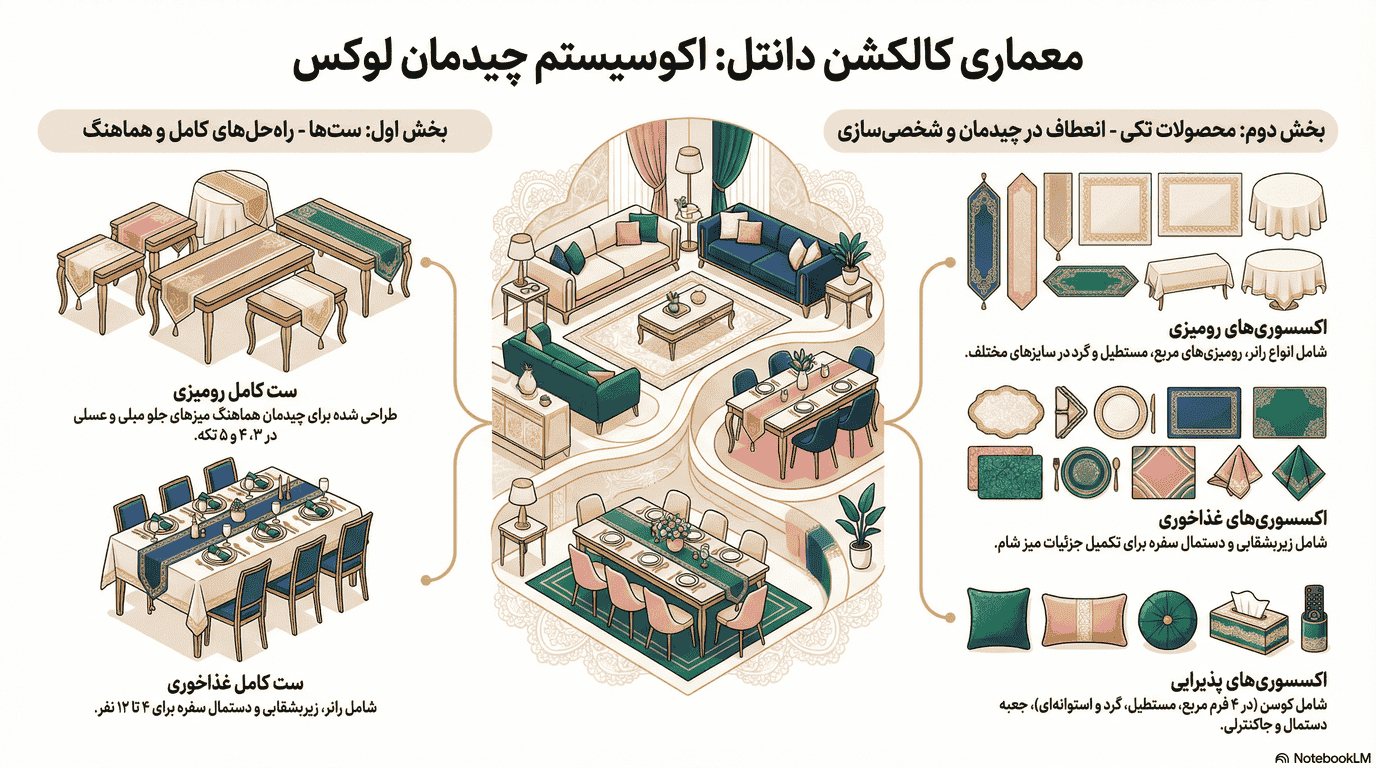گستردگی محصولات کالکشن دانتل، از ستهای آماده تا اکسسوریهای مکمل، به هر فردی اجازه میدهد تا بر اساس نیاز و سلیقه خود، چیدمانی منحصر به فرد و هماهنگ را تجربه کند.